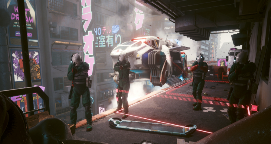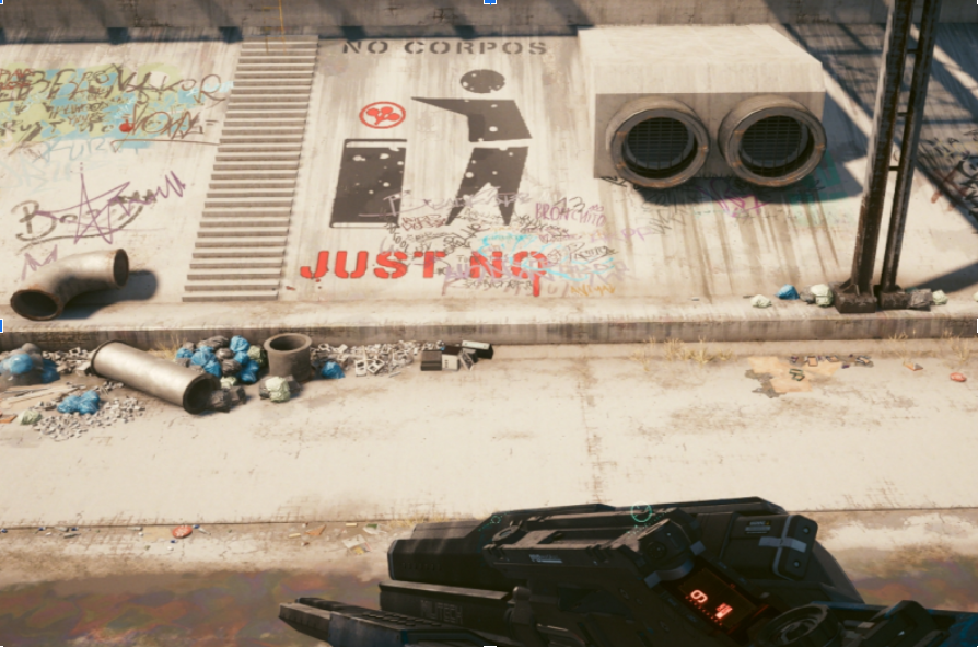 As in Deus Ex and other cyberpunk-themed games, this RPG allows one to play at being a ‘red detective’ who uncovers the atrocities of capitalism. For instance, when reading one of the multitude of ‘shards’ of textual information that can be discovered from fallen enemies or hacked computers in Night City, V learns of an exchange between a Militech officer and his superior, whereby the former requests authorization to open fire on striking workers who are not ‘responding to orders.’ Along similar lines, to protect corporate interests, the NCPD’s arsenal includes not only officers and SWAT teams, but also cyborg sentinels and elite airborne ‘MaxTac’ squads. As rackets ‘struggl[ing] for as great a share as possible of the surplus value,’ gangs and megacorporations alike compete in Night City for territory, arms, resources, labour, and political power. In keeping with Gramscian theories of hegemony, media throughout the Night City environment reinforce conservative-authoritarian messages about the need to obey the authorities and dedicate oneself to work.