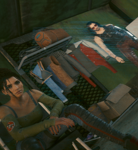 Besides its stunning graphics, the most unique aspect of Cyberpunk is its plot, which features physical and mental illness; the horrors of capitalist oppression, war trauma, and medical experimentation; and femicide, suicide, and mortality. That being said, these grave themes can be seen as variations on established cyberpunk media models, or as deepening and expanding the same. Either way, the in-game chance of pursuing a virtual heterosexual relationship (as a cis-male V) with the desert nomad Panam Palmer, and the recurrent motif of the “damsel in distress,” may re-entrench heteronormative and patriarchal values. Panam, after all, is reminiscent of Lara Croft, the heroine from the Tomb Raider games and films, who is known worldwide among “gamer bros” as a sex symbol.